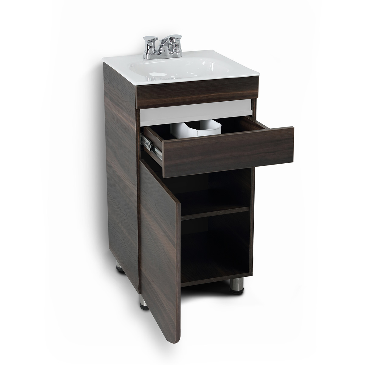 Cuenta con cajón y repisa para brindarte mayor capacidad de almacenamiento y una excelente solución para aquellos espacios pequeños, así como también con lavamanos 100 % en porcelana.