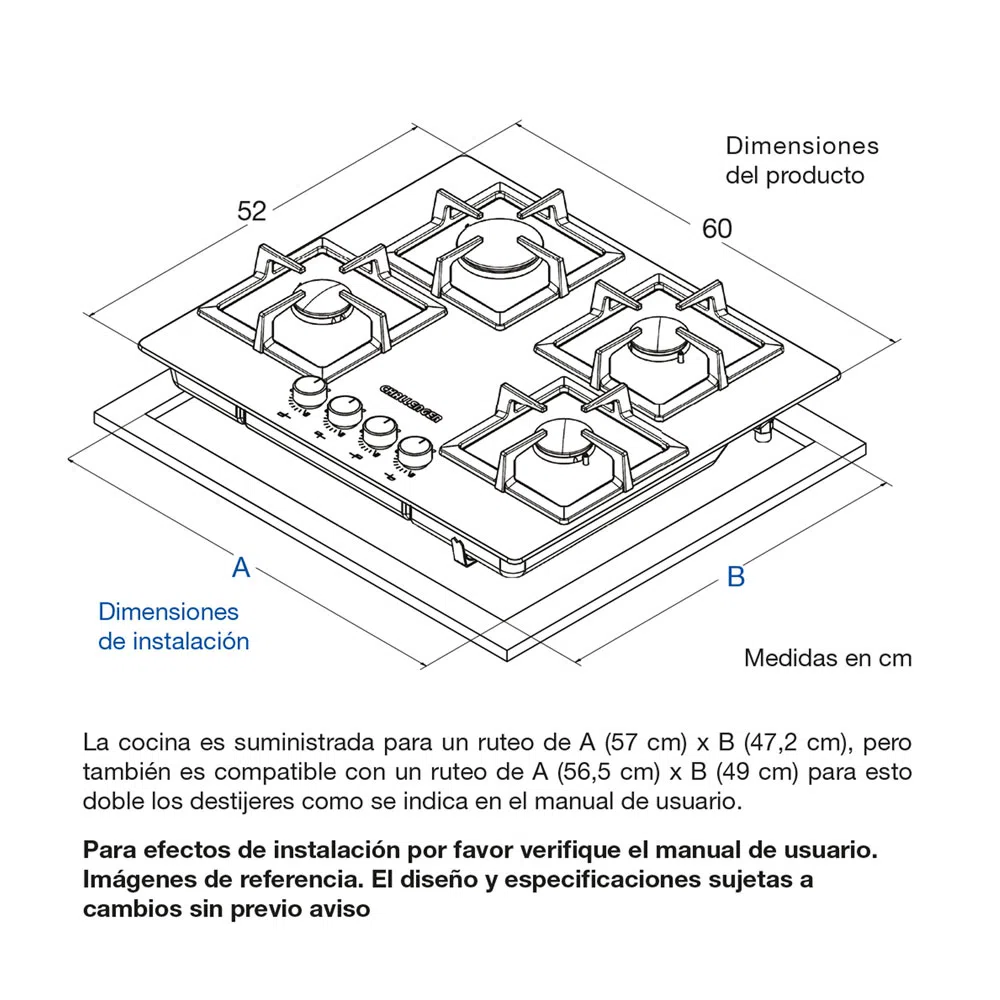 Estufa en vidrio templado de seguridad con bordes redondeados, encendido electrónico incorporado y parrillas en hierro fundido.
