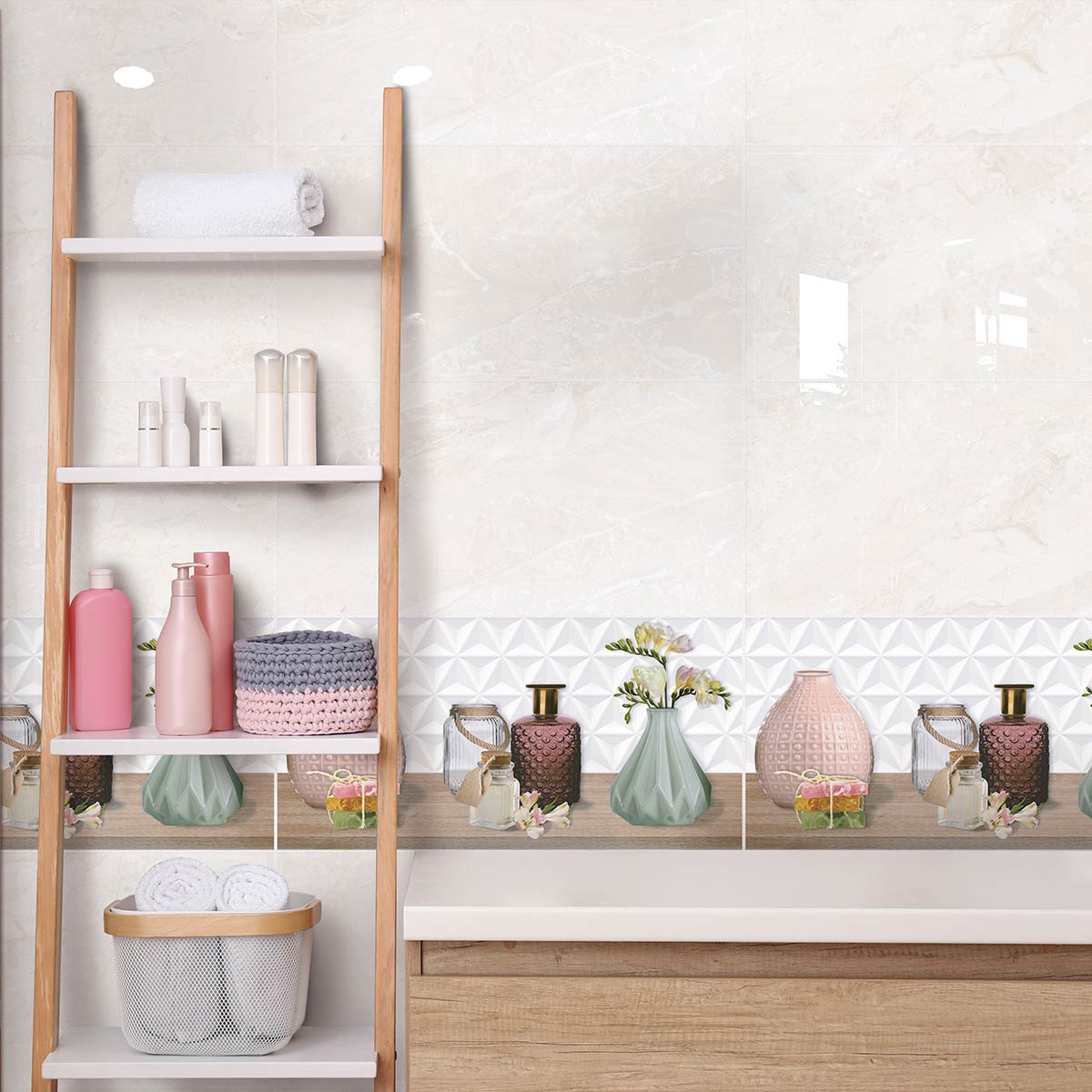 Base decorada en formato 30×60. Gracias a su diseño enriquecido con elementos de cuidado personal sobre un mesón de madera, la hace ideal para revestir y decorar nuestros baños. Es una propuesta de alto realismo en tonalidades pasteles, la cual permite gran combinabilidad con paredes en tones beige y blanco.