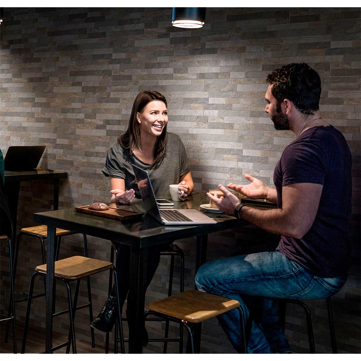La pared Corona tipo fachaleta estructurada (superficie con relieve) y acabado mate TUNJO es de color gris y en formato 34.5×62 está inspirada en las piedras naturales con corte tipo espacato; es decir un formato alargado y fino de gran popularidad por su esbeltez. Su instalación horizontal permite realzar la naturalidad y belleza del espacato. En esta fachaleta observamos una escalera de color con distintas intensidades de tonos grises con toques de café. Ideal para uso en ambientes interiores y exteriores.