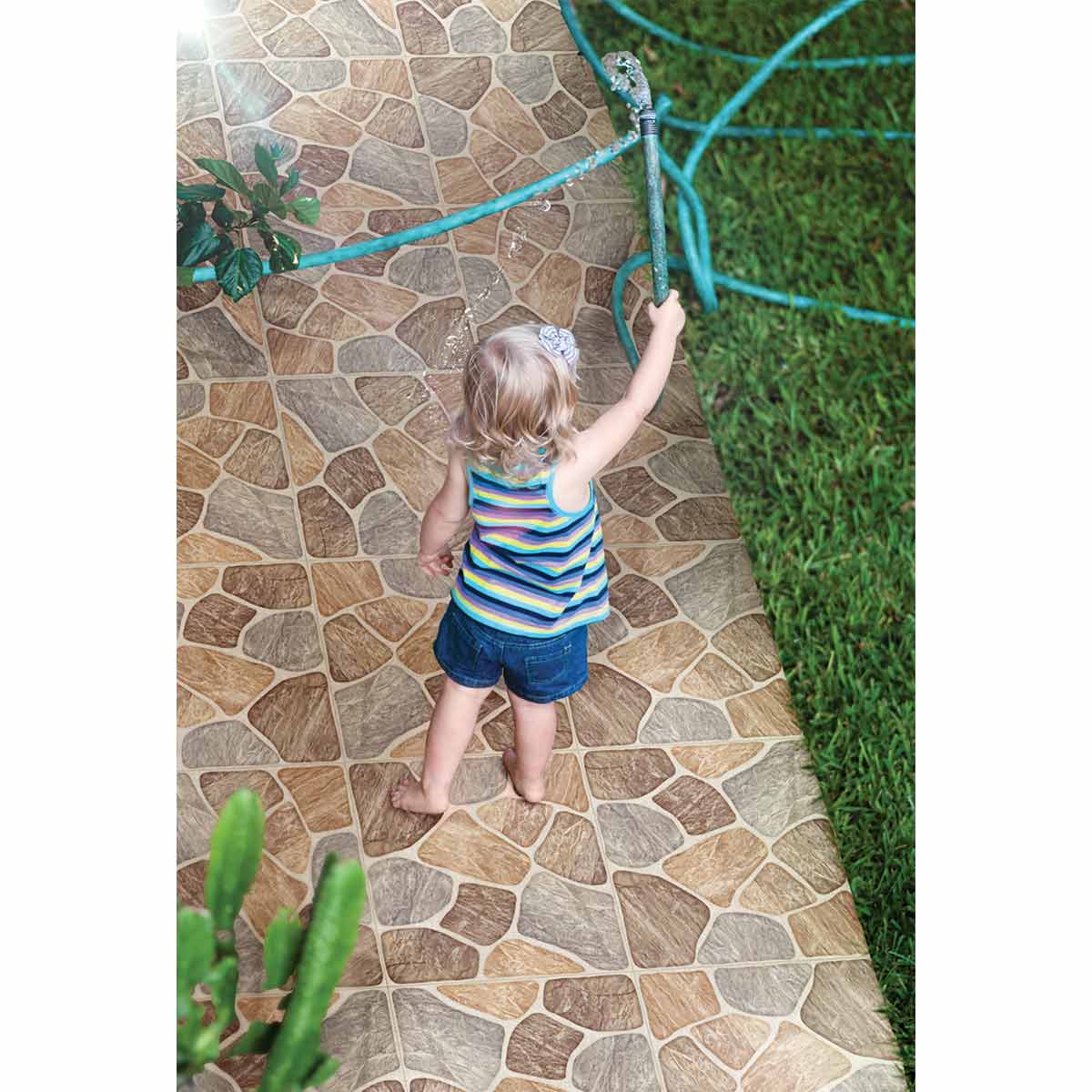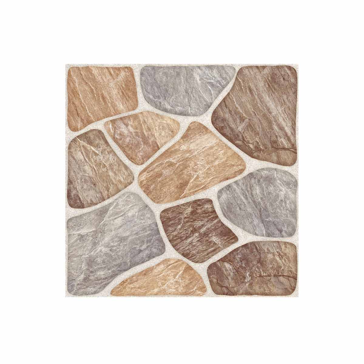 El Piso Exterior Corona PORTO de acabado mate multicolor y formato 45.8×45.8. Su diseño está inspirado en piedras grandes redondeadas con borde irregular y variaciones de color entre grises, café y beige.